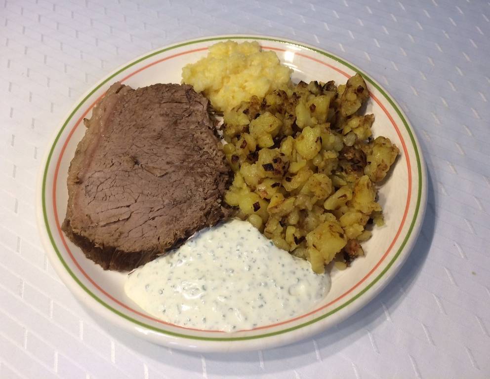 - Zum Anrichten den Tafelspitz mit Spinat, Apfelkren und den Erdäpfeln auf einen warmen Teller geben und auf der Stelle zu Tisch bringen.