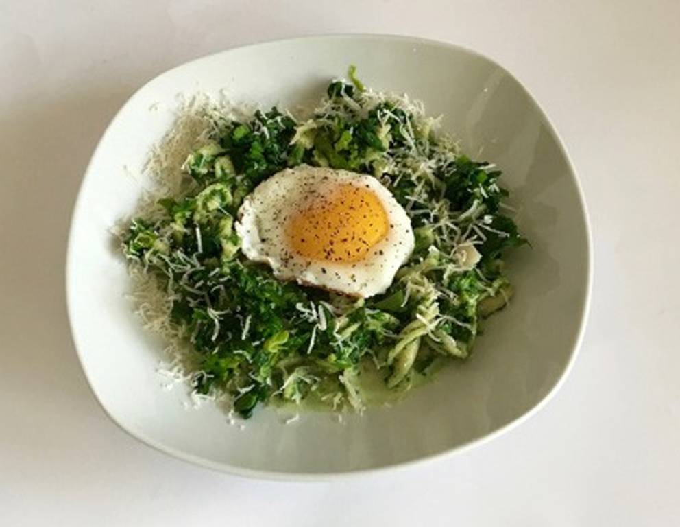 - Nudeln und Spinat mischen, auf Teller geben, darauf die Eier setzen.
