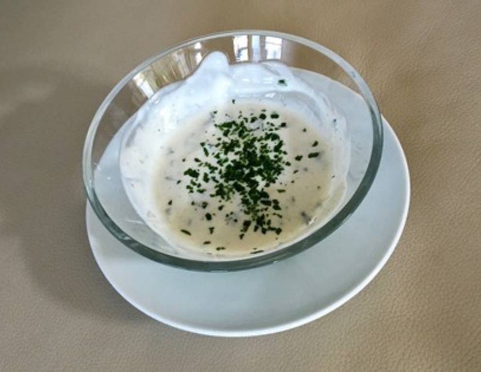 Die weiße Kräutersoße passt sehr gut zu gekochten oder gebackenen Erdäpfel, aber natürlich auch zu Gegrilltem.