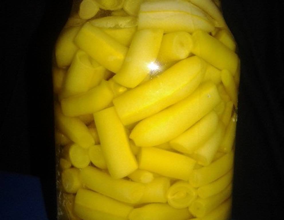 Der eingekochter Fisolensalat kann auch noch mit getrockneten Dillspitzen verfeinert werden.