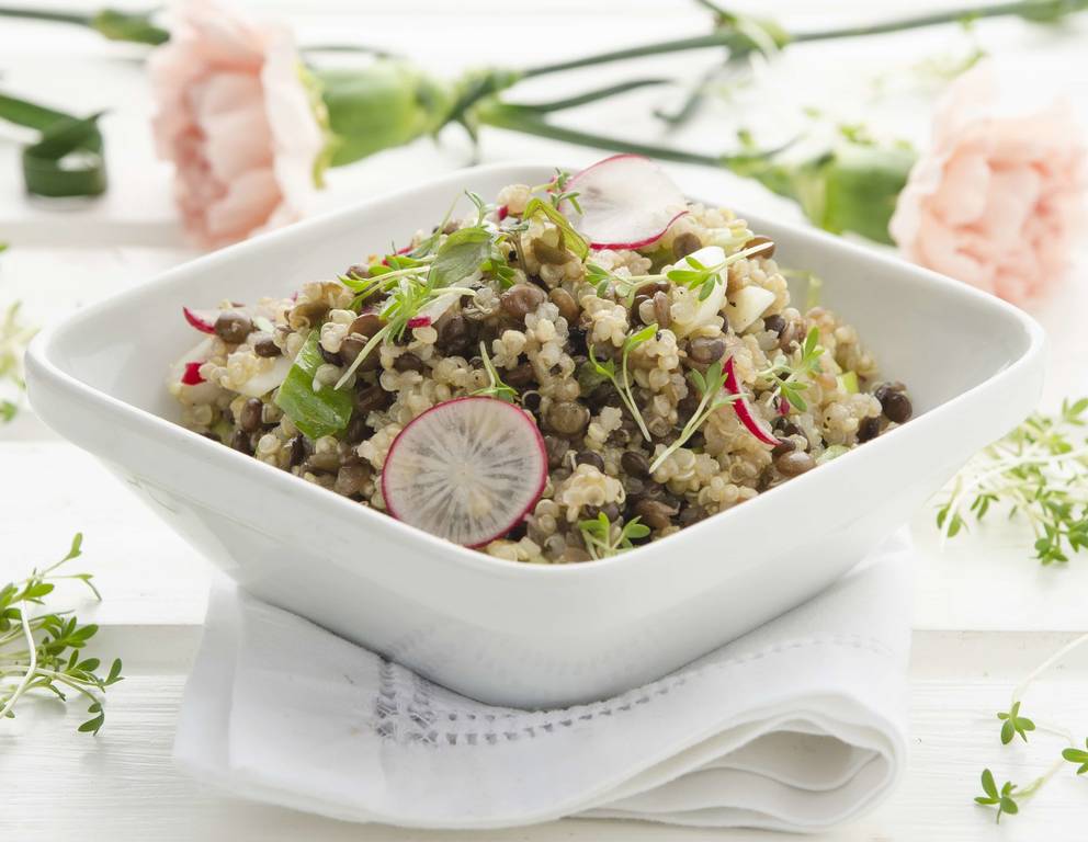 - Quinoa mit Linsen, Radieschen und Jungzwiebeln vermengen.