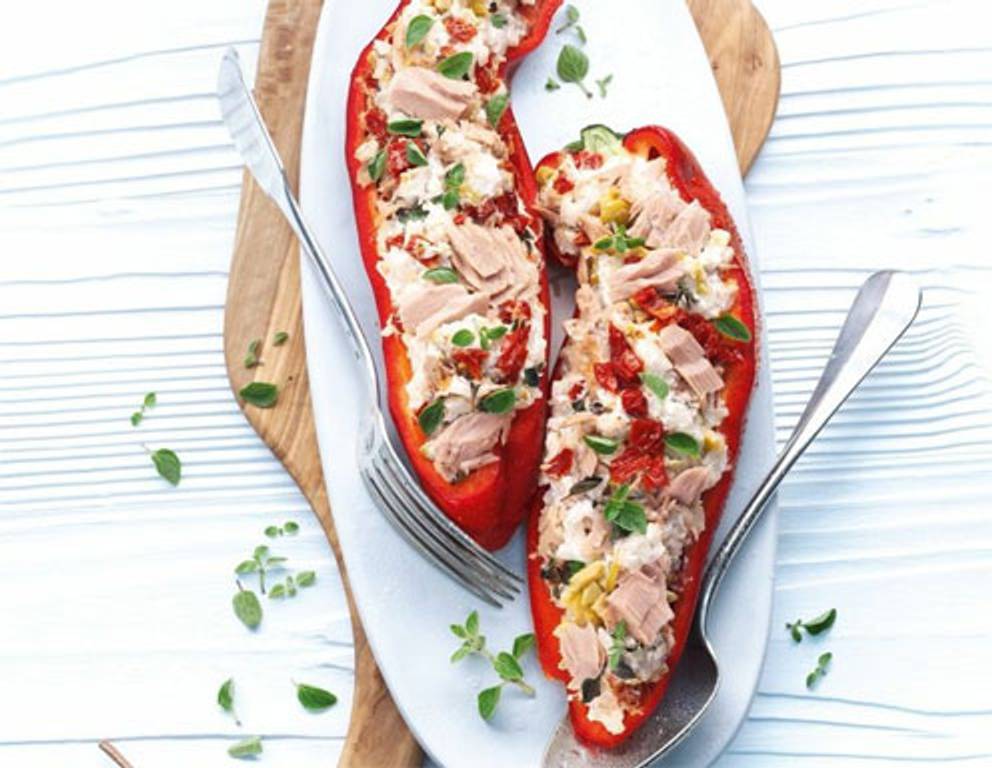 - Thunfisch, Oregano, Tomaten, Oliven, Ricotta und Reis vermengen und mit Salz und Pfeffer abschmecken. Masse in die Paprikahälften füllen und in ungelochte Garbehälter setzen. Brühe und Wein angießen und garen (bei 100°C 8-9 Minuten).