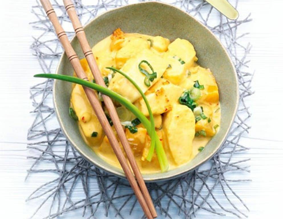 - Für das Pfirsich-Fisch-Curry den Wels säubern und in Stücke schneiden. Mit Sojasauce, Limettensaft, Salz und Pfeffer würzen.