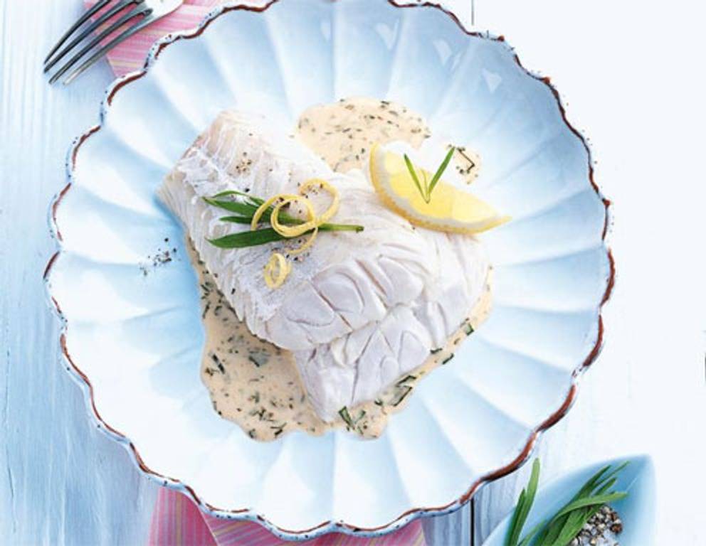 - Vor dem Servieren die restlichen Estragonblättchen hinzufügen. Den Fisch mit der Sauce übergießen und anrichten.