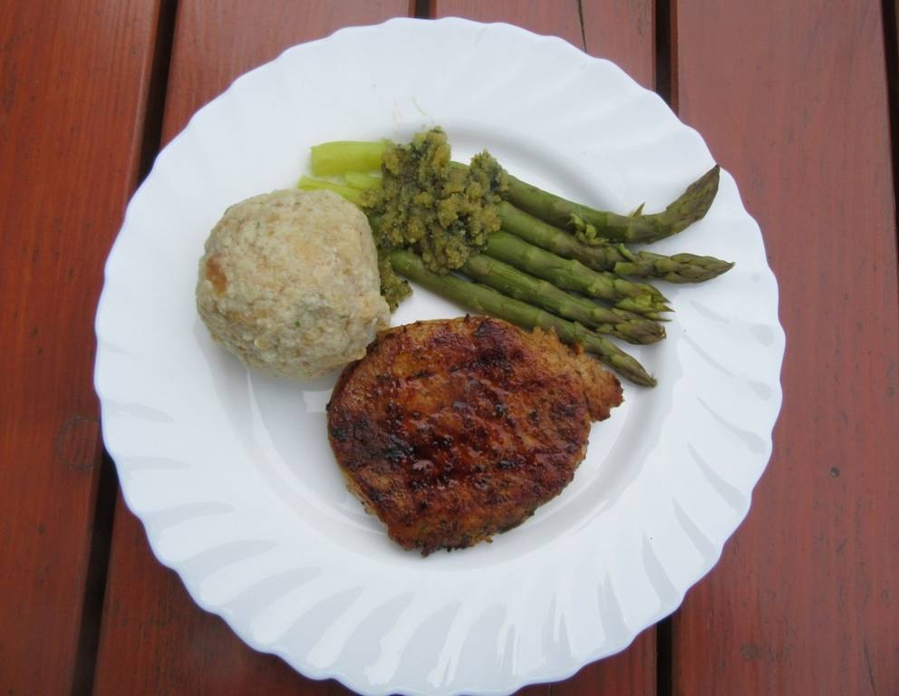 - Semmelknödel zusammen mit Schweinekoteletts und Spargel servieren.