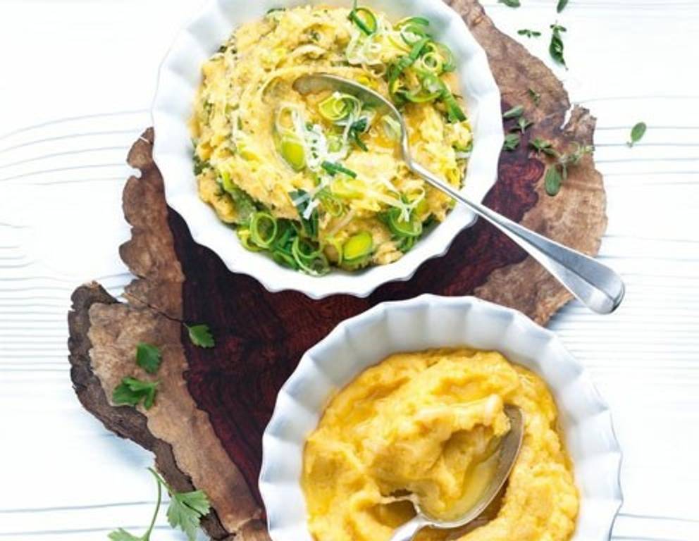 - Inzwischen Majoran- und Petersilienblättchen abzupfen und hacken. Polenta halbieren, unter eine Hälfte beide Käsesorten und 1 EL Butter rühren. Lauch, Kräuter und übrige Butter unter die restliche Polenta rühren und jeweils abschmecken.