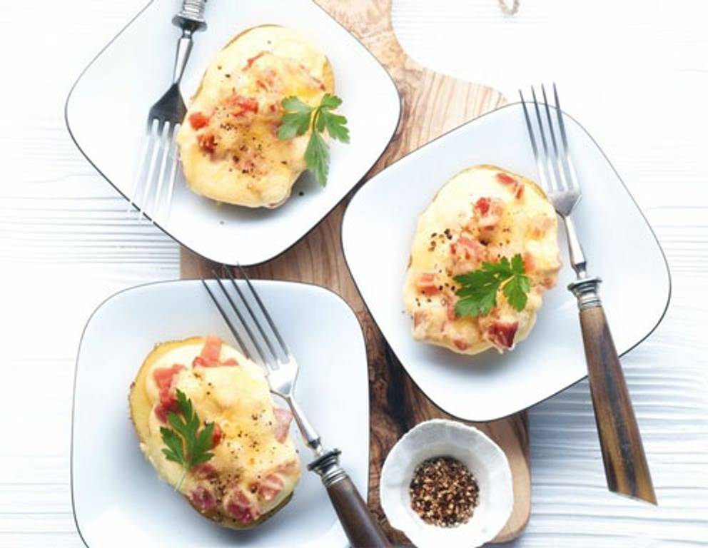 Höhlen Sie die Kartoffeln etwas aus, bevor die Füllung hineingegeben wird. Vegetarier können den Schinken weglassen.