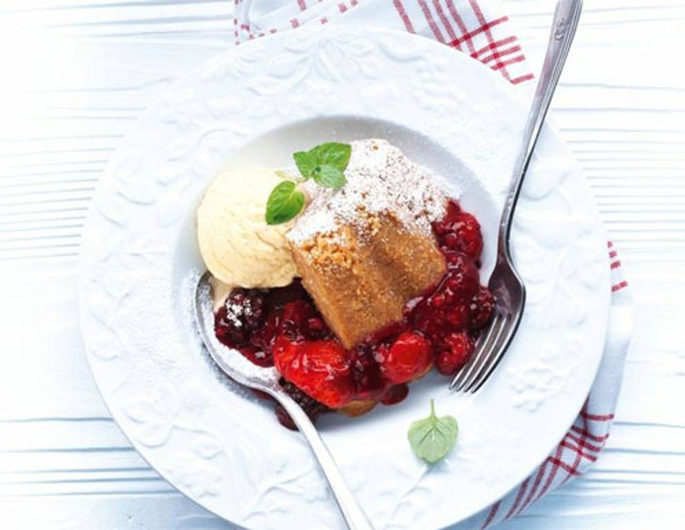 - Eine Puddingform (ca. 1,25 l Inhalt) fetten, ¾ des Zwiebackteigs hinein geben und an den Rändern seitlich hochdrücken. Beeren einfüllen und leicht andrücken. Mit übrigem Teig abdecken und den Rand gut festdrücken. Puddingform mit dem Deckel verschließen und garen (bei 100°C 60 Minuten).