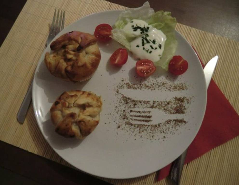 - Die Füllung in die mit Teig ausgelegten Formen füllen und den überstehenden Teig darüberklappen. Die Muffins sollten vollständig von Teig umhüllt sein, damit sie nicht ausrinnen. Muffins mit etwas Milch bestreichen und in den Ofen geben. Die Blätterteigmuffins bei 200°, ca. 30 Minuten bei Heißluft backen.