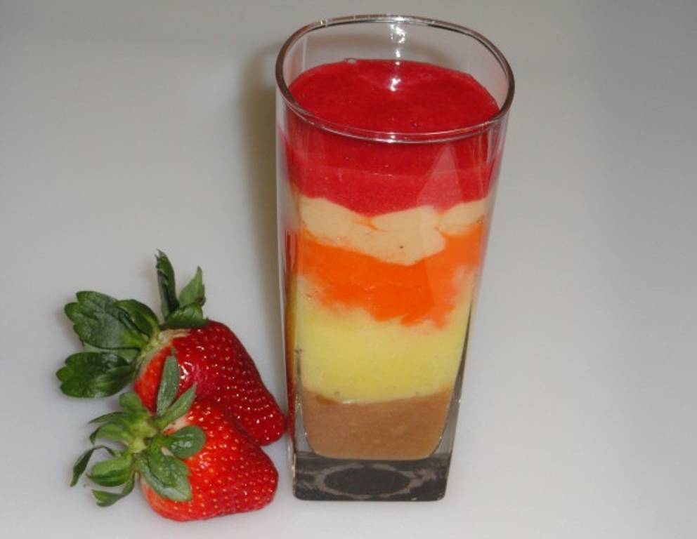 - Für den Smoothie die Früchte alle getrennt pürieren. In einem Glas der Reihe nach schichten (Nicht gießen, weil es sich sonst vermischt). Eventuell mit einer Erdbeere verzieren und den Smoothie sofort servieren.