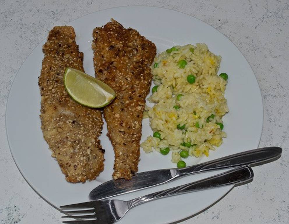 - Dabei die Nussmischung andrücken. Die Fischfilets von beiden Seiten in Fett goldbraun herausbacken und das Seehechtfilet mit Knusperpanade auf Küchenkrepp abtropfen lassen.