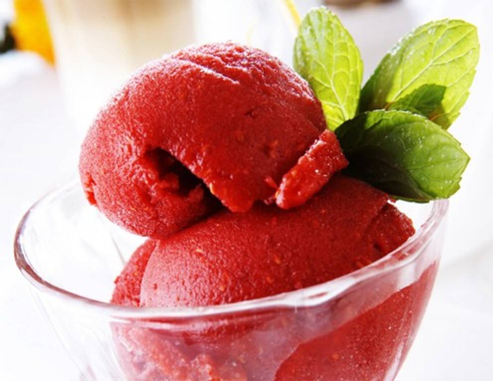 Dieses Erdbeer-Minze-Sorbet eignet sich hervorragend als Begleitung für zahlreiche Desserts, etwa für duftige kleine Buchteln mit Vanillesauce.