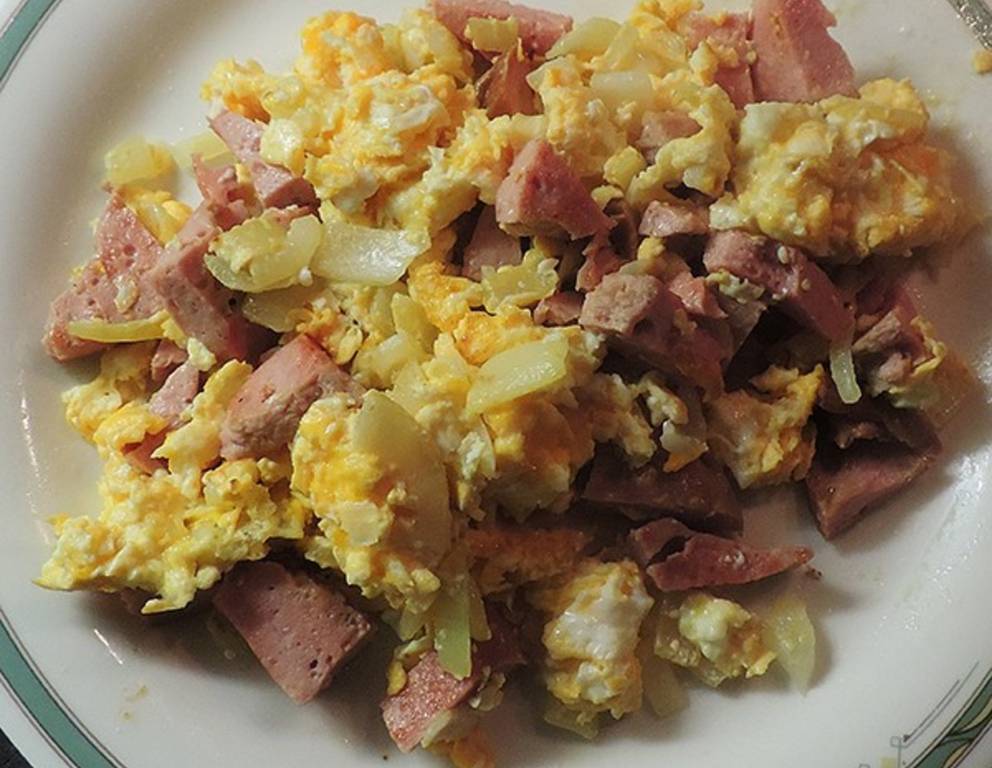 - Eier gut verrühren, mit Salz und Pfeffer würzen. Öl in der Bratpfanne erhitzen. Eiermasse hineingießen und etwas stocken lassen. Leberkäse, Frühlingszwiebel und Paradeiser dazugeben.