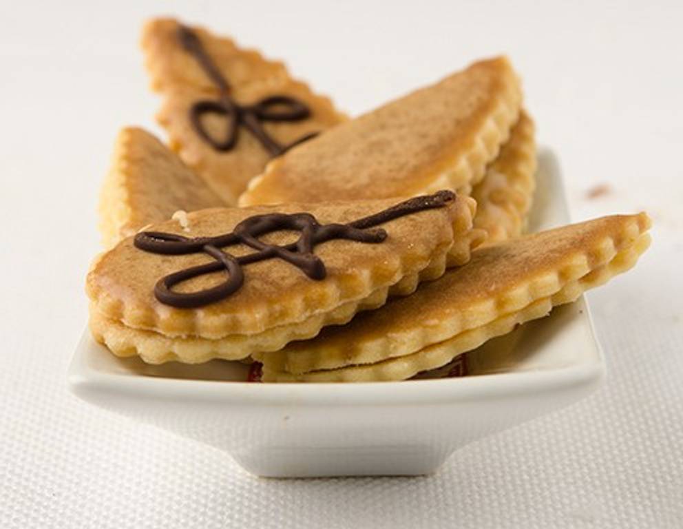- Für die gefüllten Kakaokekse das Mehl mit Stärke und Backpulver verquirlen und eine Mulde in die Mitte drücken. Butterstückchen, Ei, Zucker und Milch einfüllen und das Ganze zusammenkneten. Den Teig in Folie einschlagen und ungefähr 30 Min. im Kühlschrak ruhen lassen.