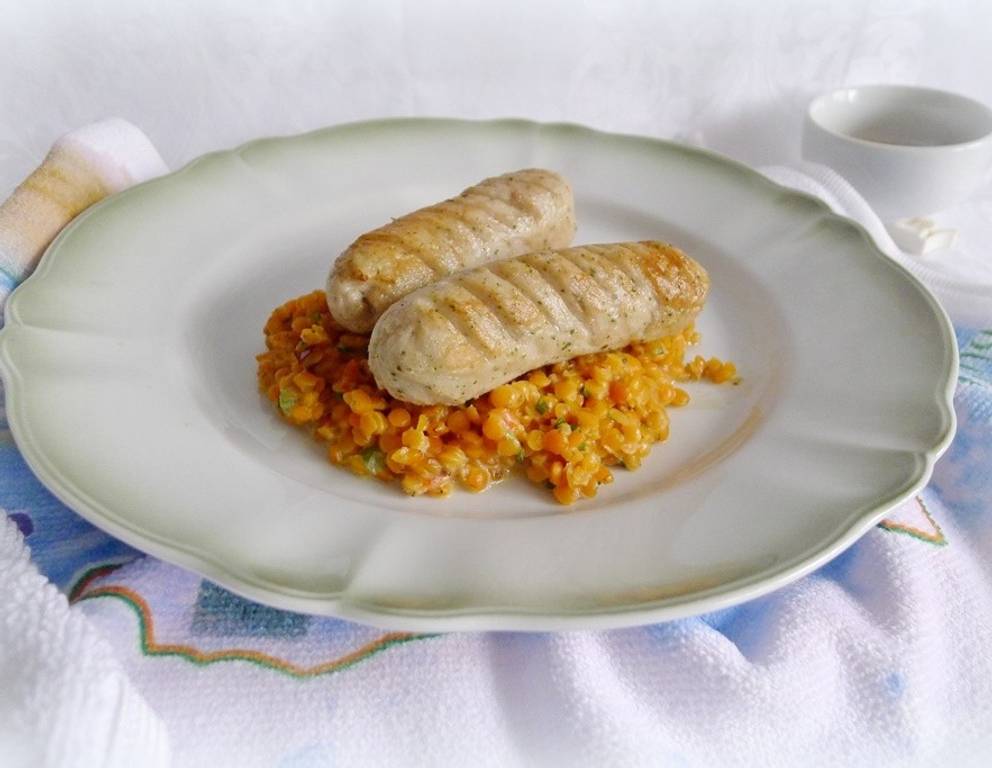 - Die Linsen auf Tellern anrichten. Weißwurst darauf anrichten und mit Schnittlauch dekoriert servieren.