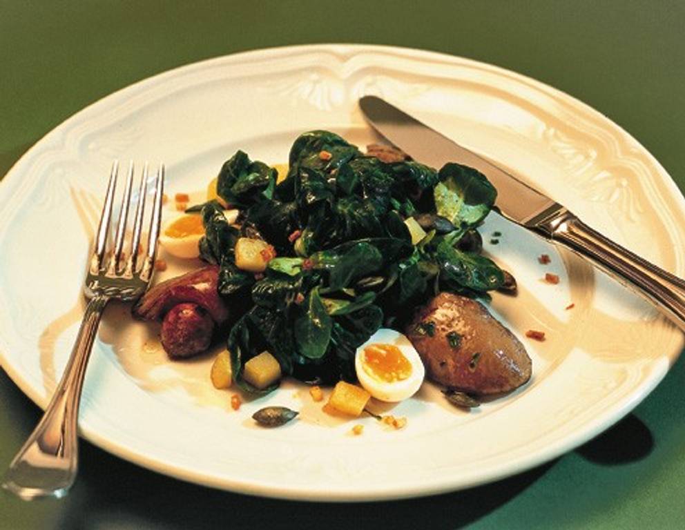 - Die Hühnerleberstücke mit Rotwein, Rosmarin, Thymian, Lorbeer und Knoblauch 2-3 Stunden marinieren. Auf Küchenpapier abtropfen lassen und mit Salz sowie Pfeffer würzen. Die Hühnerleber mit Rosmarin- und Thymianzweiglein in geklärter Butter bei ca. 80 °C 8-10 Minuten ziehen lassen (sie sollte noch leicht rosa sein). Mit einem Siebschöpfer vorsichtig aus der Butter heben und mit Sonnenblumenöl sowie Weinessig marinieren. Bei Bedarf noch leicht nachwürzen. Gewaschenen Vogerlsalat mit Erdäpfelwürfeln, Kürbiskernöl, Mostessig, Salz und Pfeffer marinieren. Auf kalten Tellern anrichten. Mit gerösteten Kürbiskernen bestreuen. Die Leber um den Salat legen und mit den geschälten, gekochten Wachteleiern garnieren.