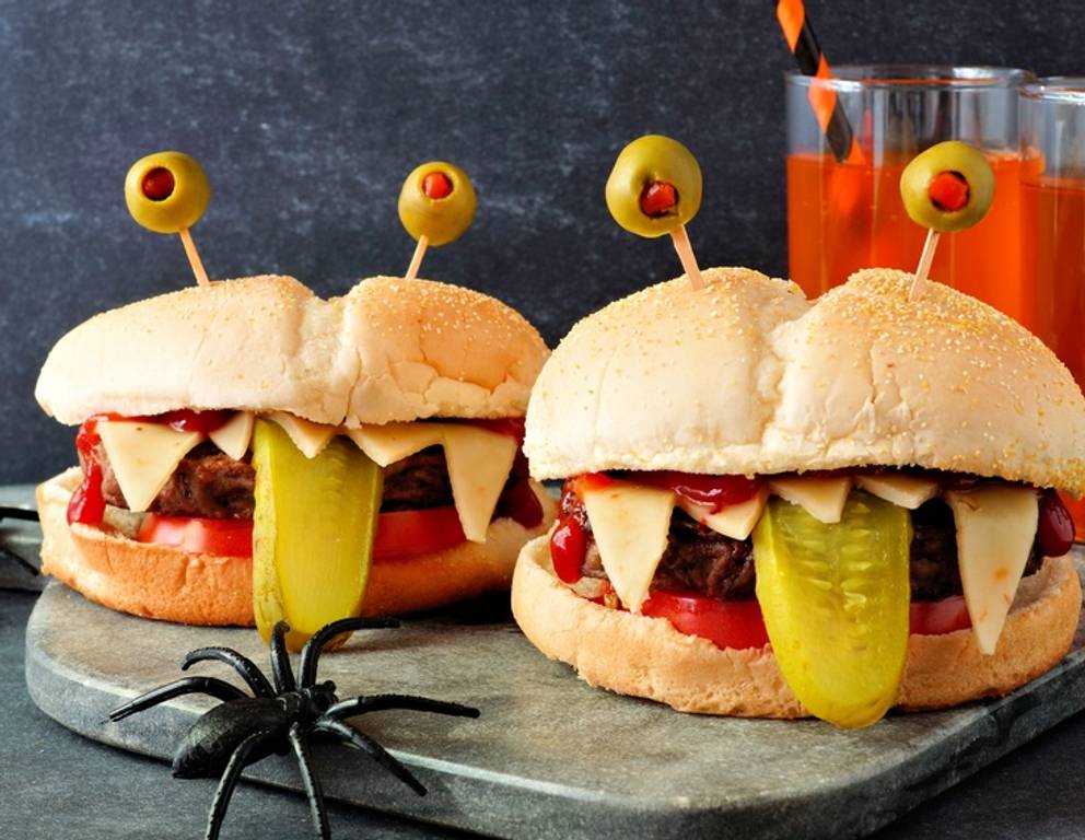 - Die oberen Bun-Hälften mit je 1 EL Ketchup bestreichen. Je zwei Oliven-Zahnstocher oben hineinstecken und die fertig belegten Burger damit abdecken.