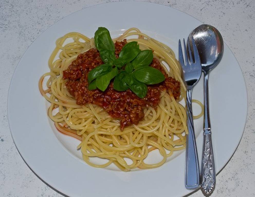 Vor dem Servieren können die Spaghetti Bolognese noch mit frisch geriebenem Parmesan bestreut werden.