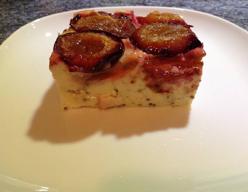 Der Topfenkuchen mit Chia schmeckt mit Früchten (z.B. Zwetschken, Marillen usw. ) belegt besonders gut, ist aber auch ohne Früchte ein saftiger Kuchen.