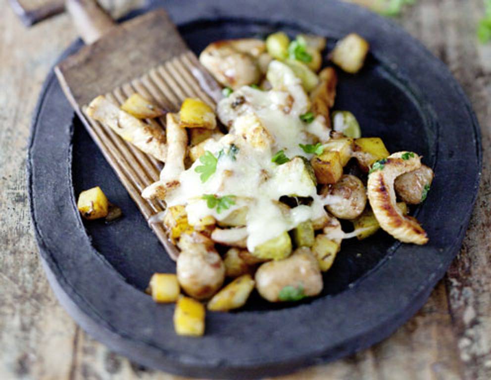 - Die Käserinde entfernen und den Käse grob reiben. Die Gröstlmischung in die Pfännchen geben, mit Käse bestreuen und im heißen Gerät ca. 10 Minuten backen, bis das Fleisch und die Würste gar sind und der Käse geschmolzen und leicht gebräunt ist.