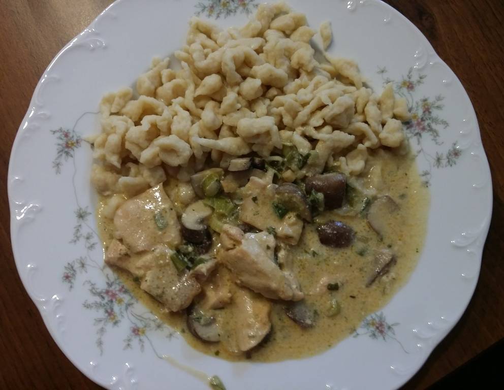 Zu dem Hühnergeschnetzeltes mit Pilzen passen am besten Spätzle.