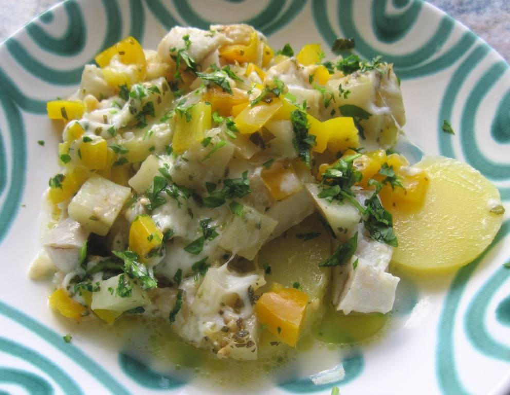 - Leicht salzen und pfeffern. Auf die Erdäpfel die Fischfilets legen und ebenfalls salzen und pfeffern. Die Gemüsemischung auf dem Fisch verteilen, nochmals salzen und pfeffern.