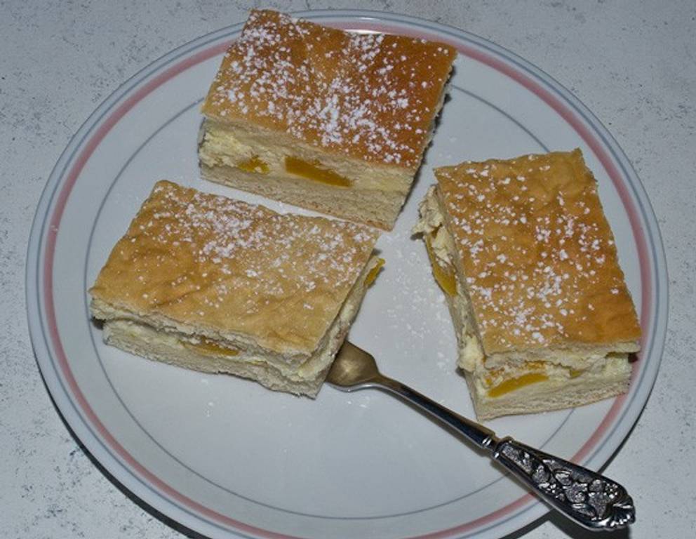 Dieser Topfenkuchen ist herrlich saftig. Alternativ zu Dosenpfirsichen schmeckt dieser Kuchen auch mit Äpfeln. Als Saft verwendet man einfach Apfelsaft. So wird der Kuchen auch weniger süß.
