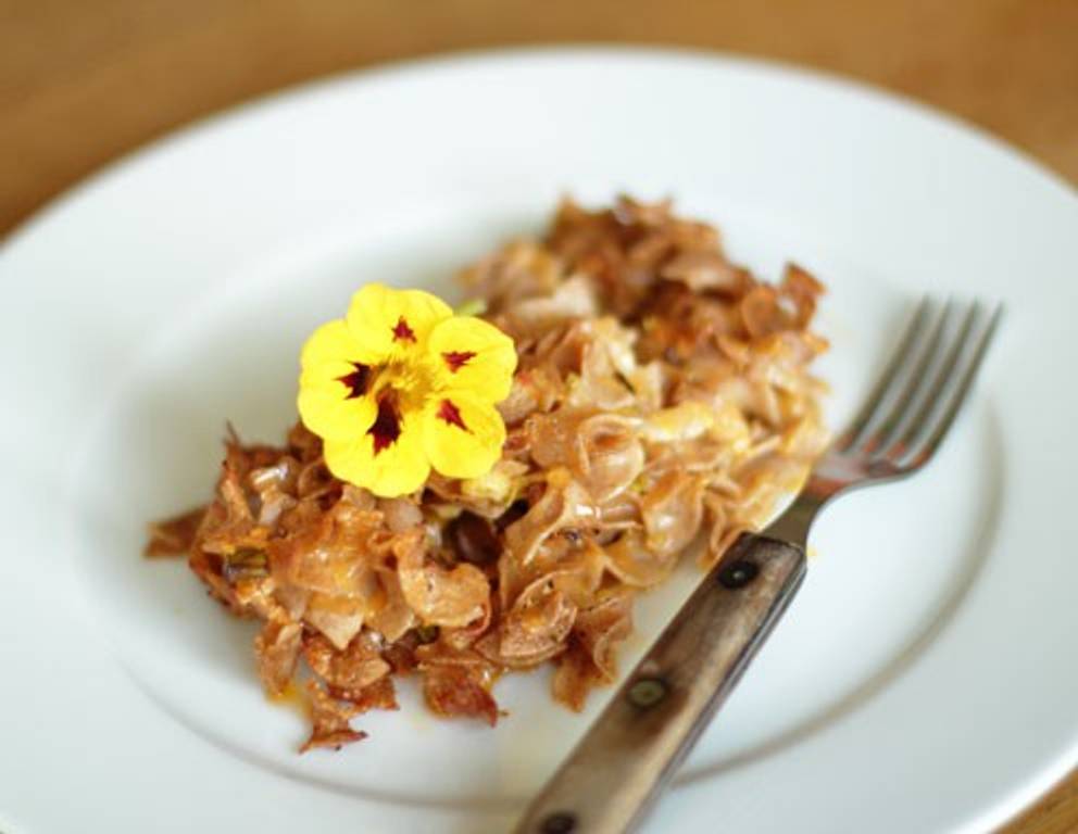 Dieser Dinkelfleckerl-Käse-Auflauf passt gut zu würzigen Geflügelgerichten oder ist mit Salat und einer Joghurtsauce genossen eine vollwertige, vegetarische Hauptspeise.