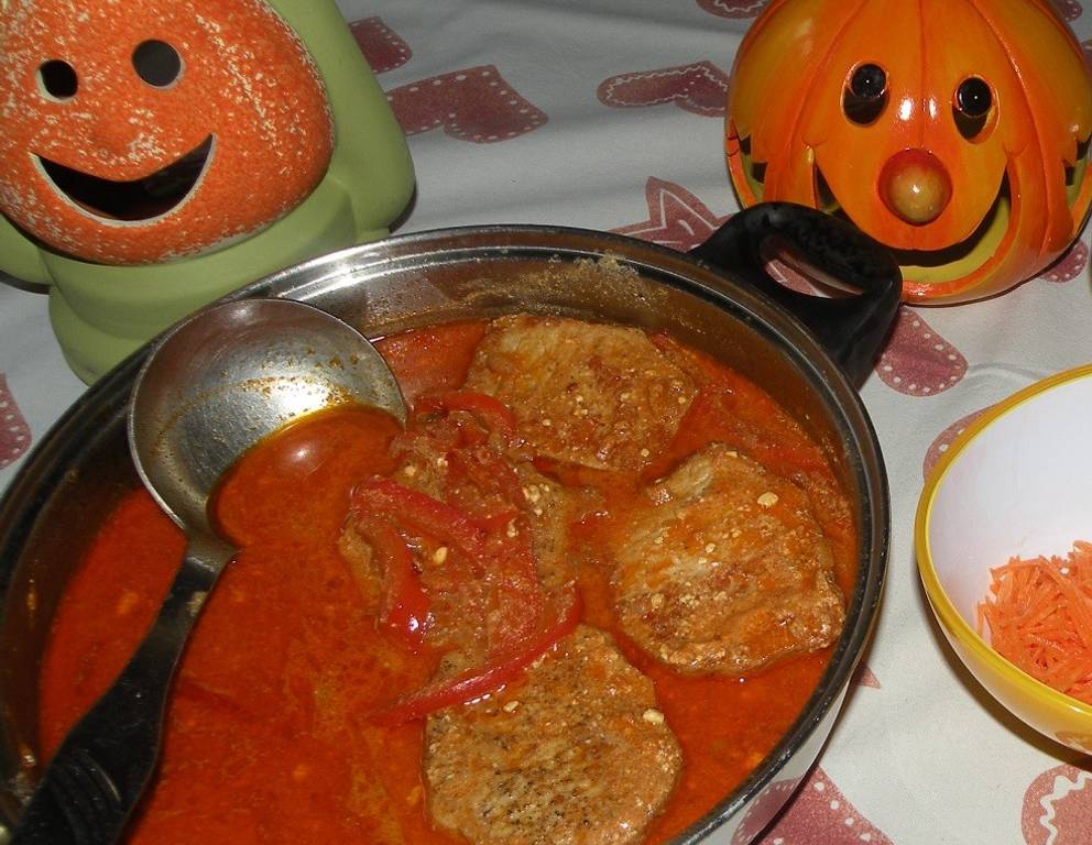 - Nach 15 Minuten das Fleisch herausnehmen, die Sauce pürieren, den in Streifen geschnittenen roten Paprika dazugeben und noch 5 Minuten weiter kochen.