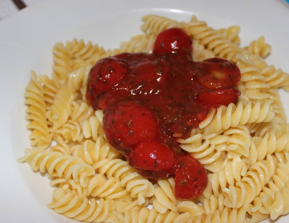 Statt Fusilli mit Tomatensauce ist auch jede andere Pasta mit dieser Tomatensauce passend und köstlich.