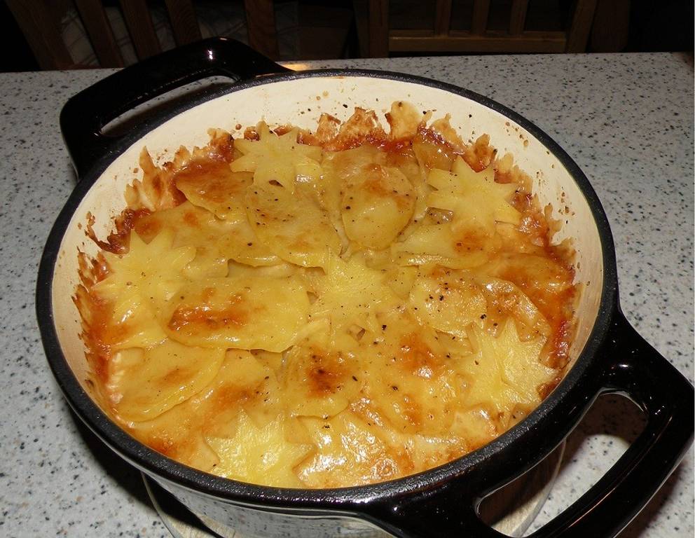 Man kann die Äpfel im Erdäpfel-Petersilwurzel-Gratin auch einfach weglassen. Oder man ersetzt sie durch Birnen. Diese Variante ist ebenso überaus schmackhaft.