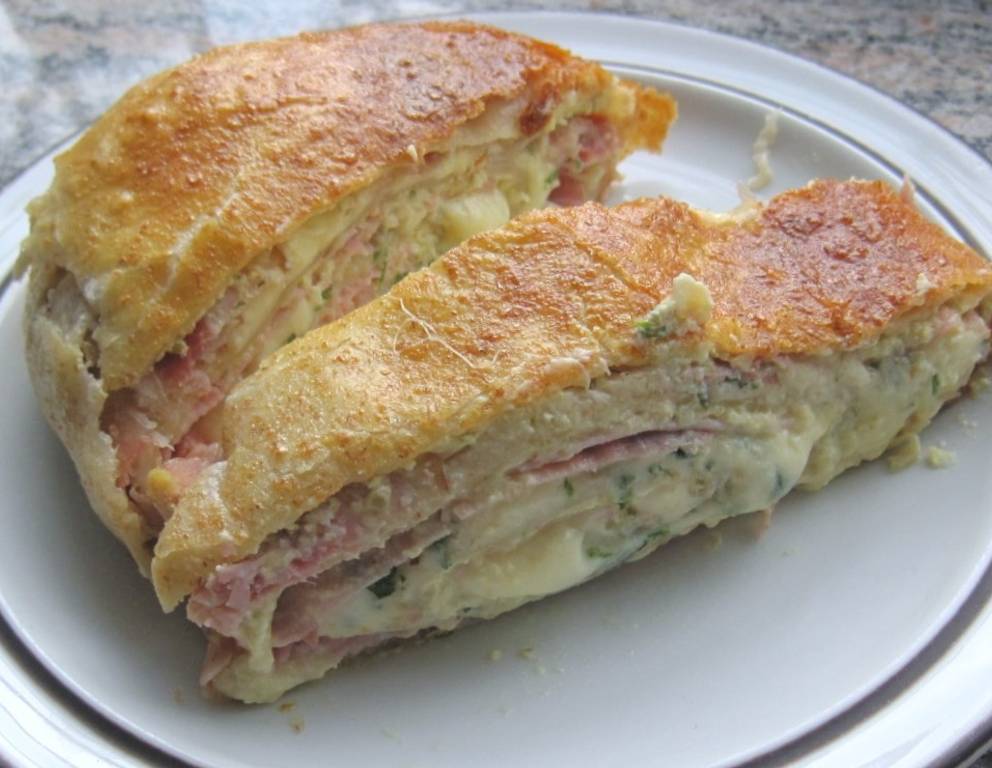 - Den Teig mit der Frischkäsecreme bestreichen, dabei am oberen Rand ca. 8 cm freilassen. Schinkenblätter nebeneinander auflegen, Gouda auf dem Schinken verteilen und mit Petersilie bestreuen. Den oberen Teigrand mit Eiklar bestreichen. Den Strudel mithilfe des Tuches einrollen.