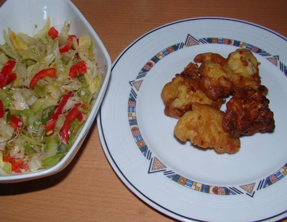 - Den gebackenen Karfiol schwimmend bei mittlerer Hitze goldbraun backen und heiß mit Salat servieren.