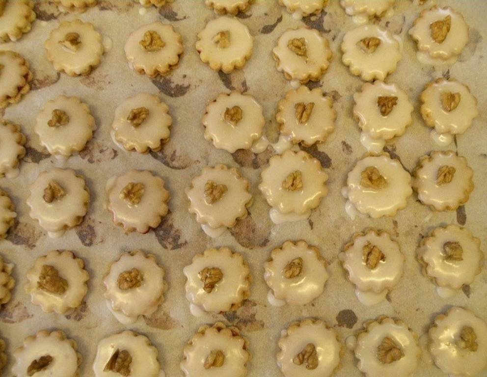- Die Kekse mit einer Seite kurz in den Guß tunken, ein Walnuss-Stückchen auflegen und die Walnusskekserl trocknen lassen.