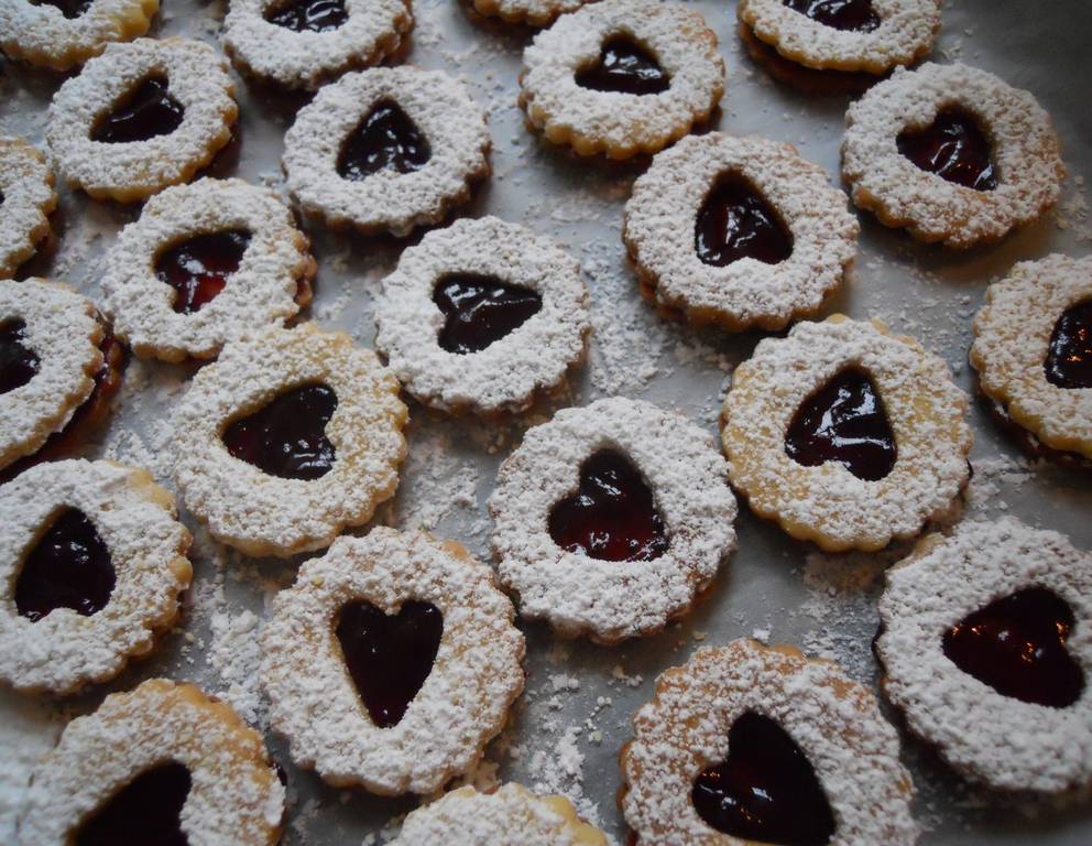 - Die Kekse mit dem Loch mit Staubzucker anzuckern und gemeinsam mit einem Keks mit Ribiselmarmelade ohne Loch zusammensetzen.