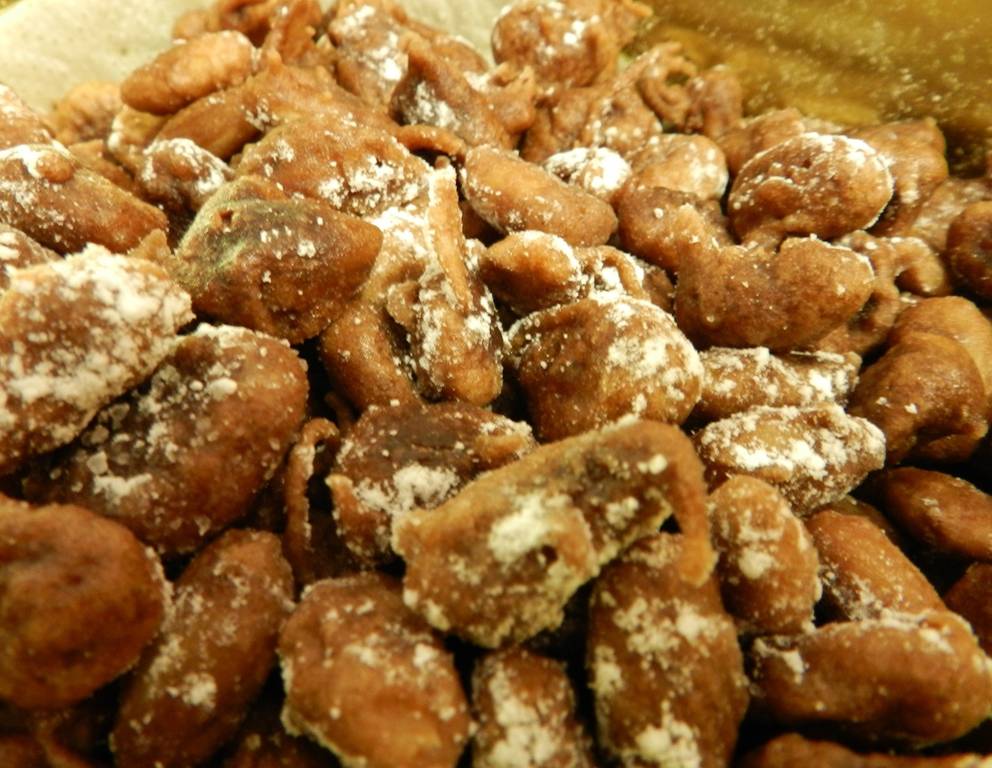 - Die Mandeln portionsweise in den Teig geben, mit einer Gabel einzeln herausfischen, kurz abtropfen lassen und ins heiße Fett geben, kurz darin ausbacken.