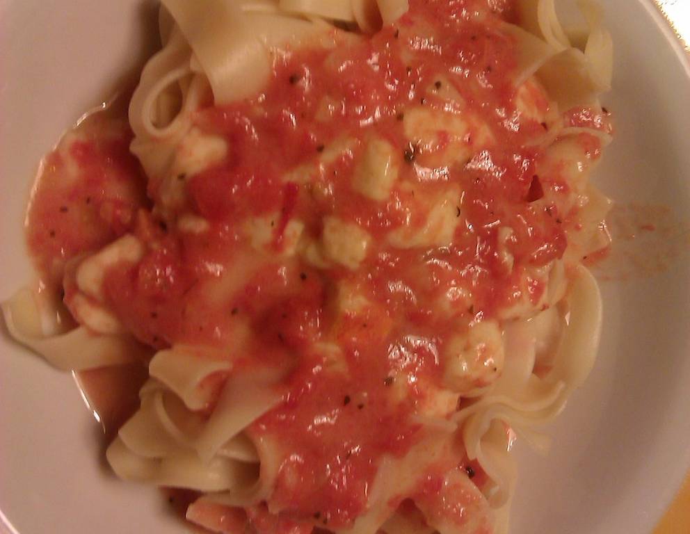 Die Käse-Tomatensauce mit Nudeln, Gnocchi oder Spätzle servieren.
