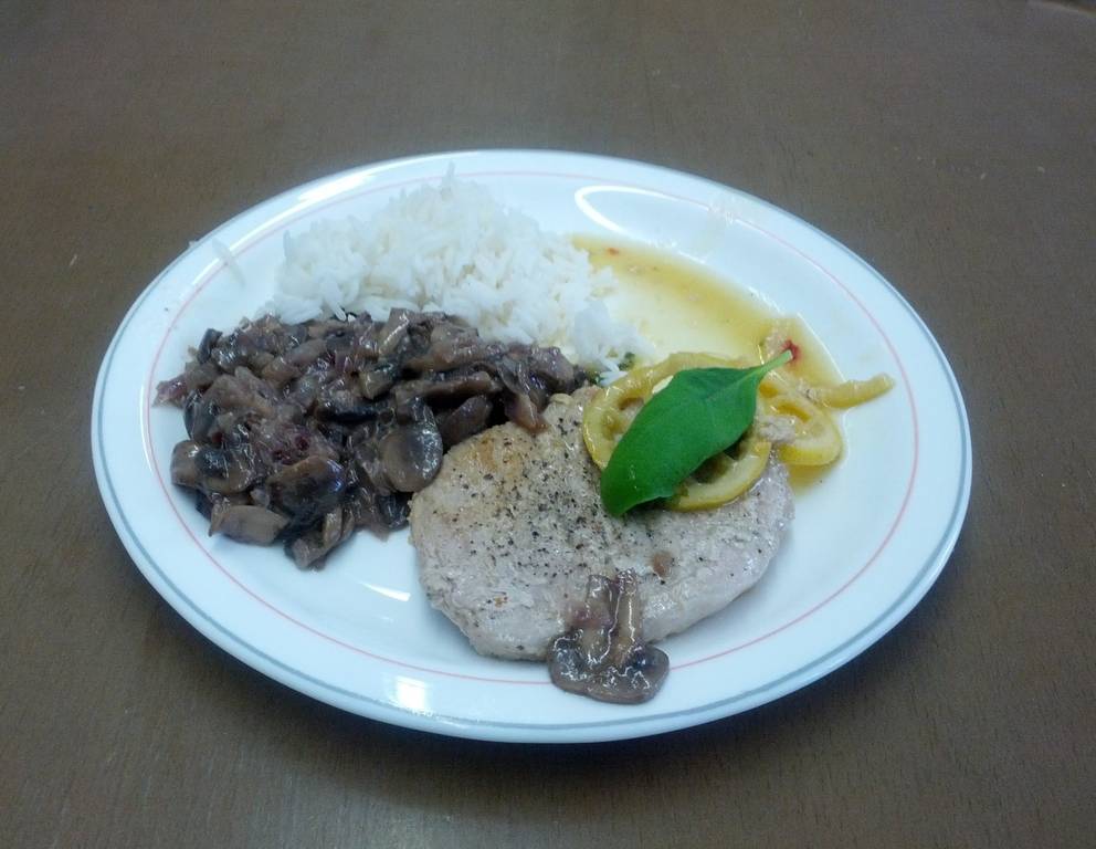 - Sauce mit gehackten Basilikumblättern und Butter verfeinern. Steak in Zitronensauce mit Reis und Champignons anrichten und servieren.