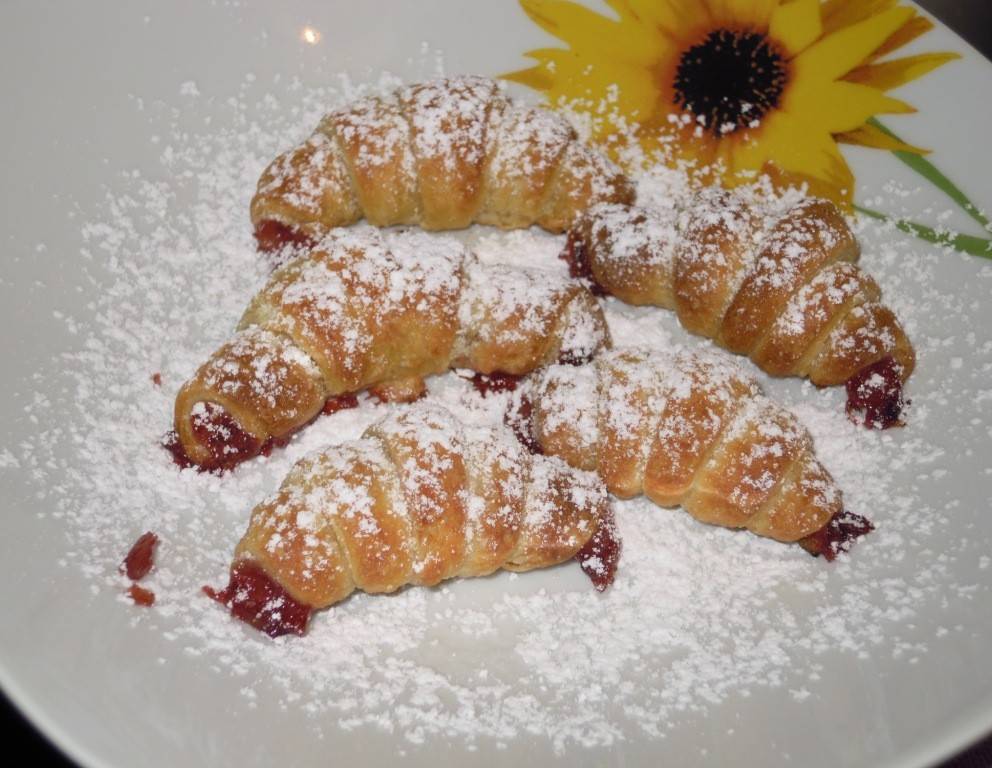 - Teig 1/2 cm dick ausrollen und Dreiecke herausschneiden. Auf jedes Dreieck Marmelade daraufstreichen. Von der Breitseite her zusammenrollen.