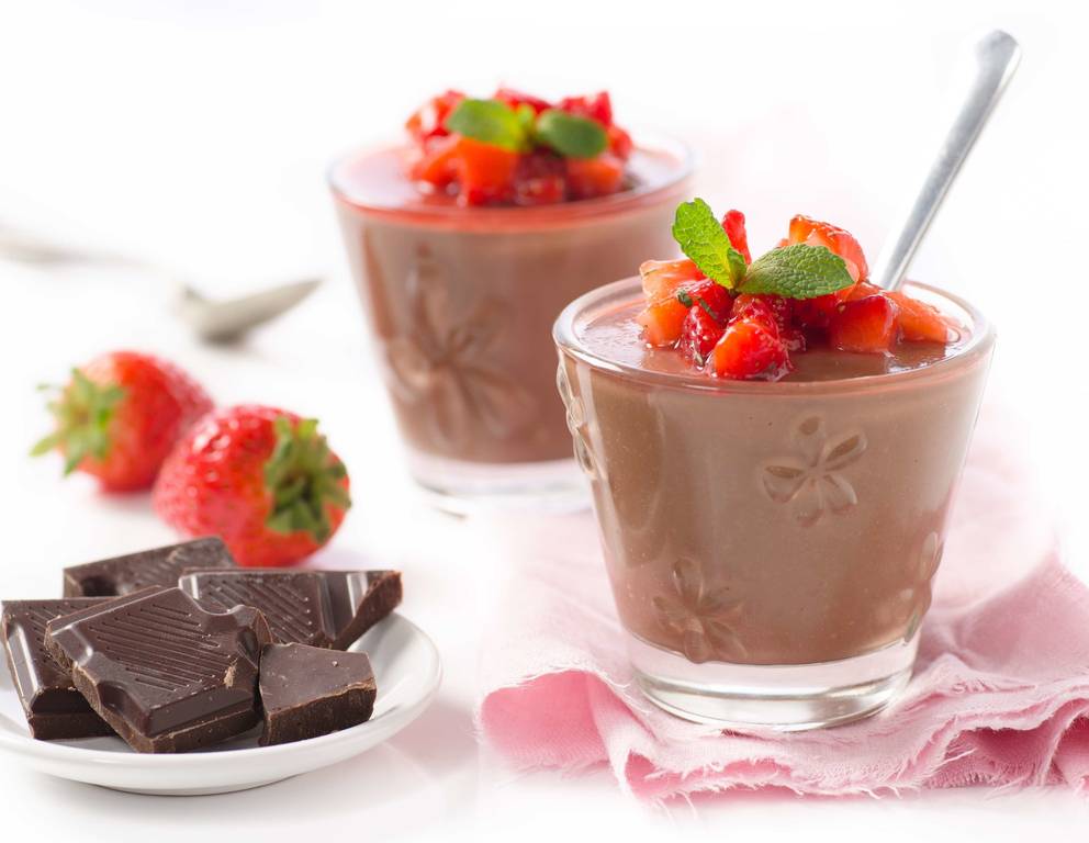 - Die vegane Schokoladenmousse gemeinsam mit den Erdbeeren anrichten und servieren.