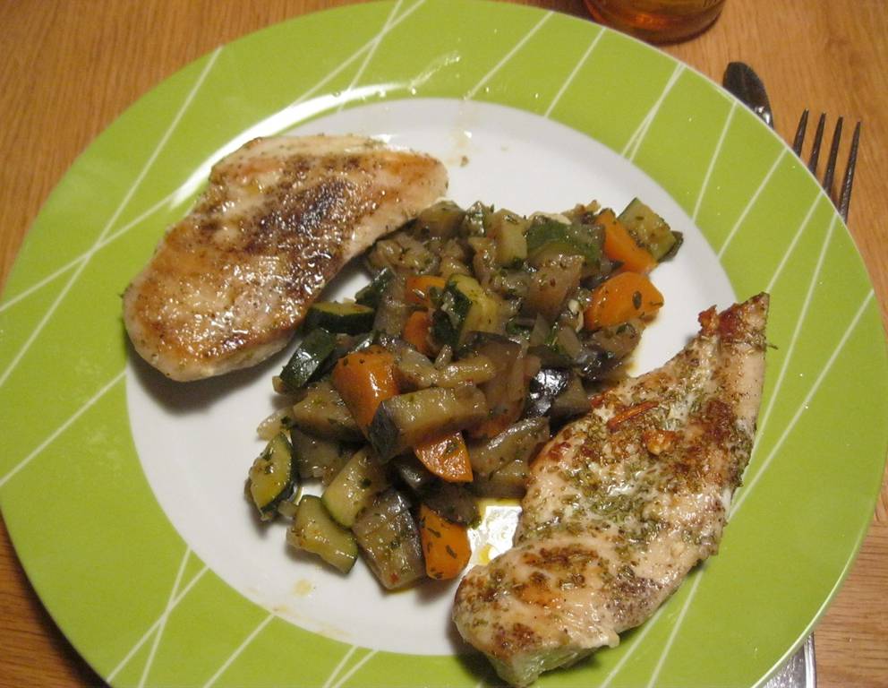 - Die Hühnerfilets mit Ratatouille servieren.