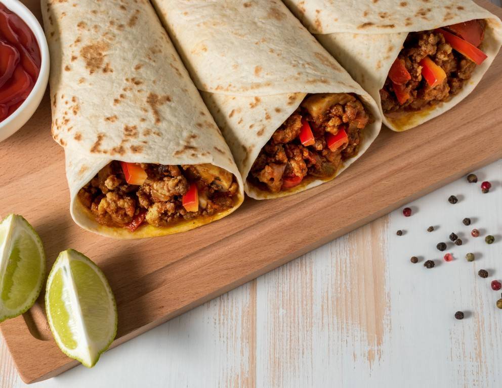 - Die gewärmten Wraps mit Faschiertem, Bohnen, Mais, Soße und geriebenem Käse belegen. Fest aufrollen und sofort servieren.