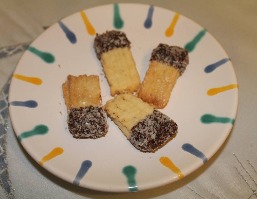 - Die Kekse goldgelb backen. Jeweils 2 Stücke mit Marmelade füllen. Am Schluss die Maschinenstangerl in Schokoglasur und in Kokosette tunken.
