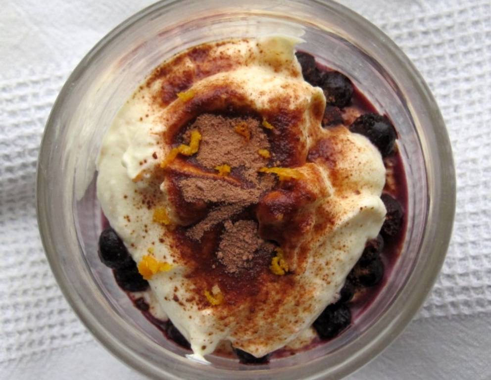 - Ein paar Heidelbeeren darauf verteilen und ein bisschen Kakaopulver darüber streuen. Noch einmal eine Frischkäseschicht, gefolgt von Heidelbeeren und Kakaopulver einfüllen.