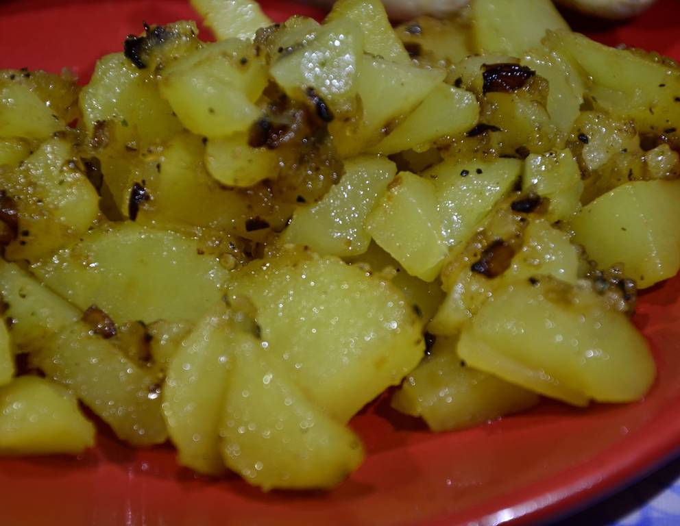 - Die blättrig geschnittenen Erdäpfel (und den fein geschnittenen Knoblauch) zugeben und unter öfterem Rühren braten, bis sie etwas anbräunen.