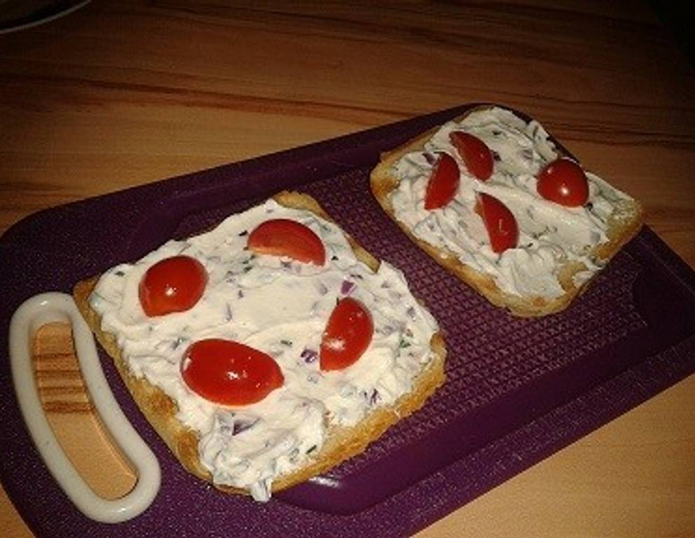 Den Topfenaufstrich mit Kräutern mit Tomaten servieren. Die Menge reicht für ca. 4 Brote, je nachdem, wie dick aufgestrichen wird.