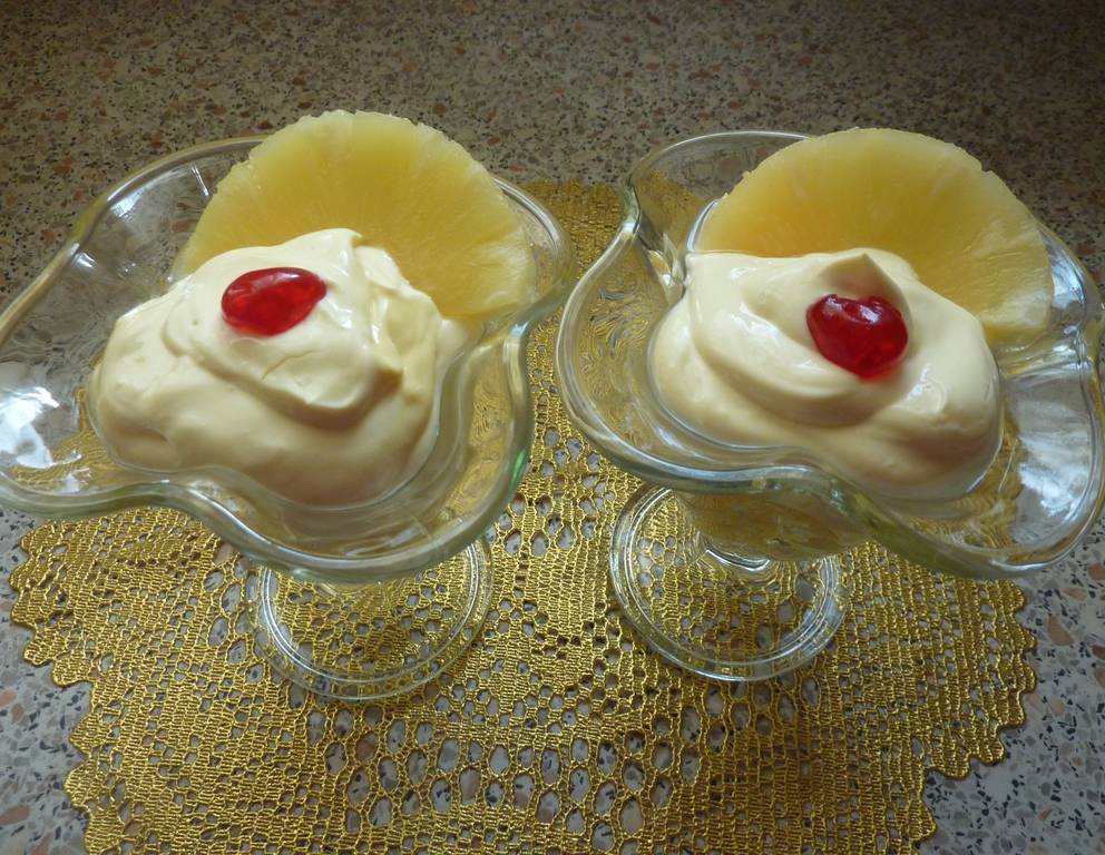- Je 2 der beiseite gelegten Ananasstücke sowie 1 kandierte Kirsche auf Spießchen stecken und die Dessertschalen damit garnieren.
