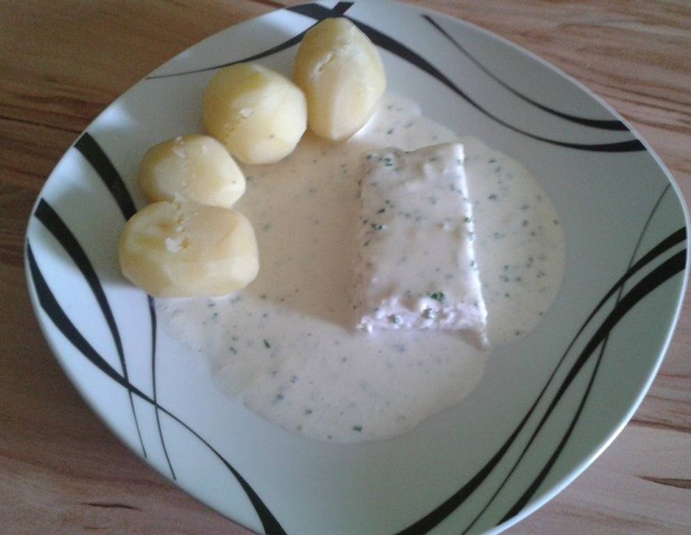 - Sobald die Kartoffeln durch und der Fisch mit der Soße fertig sind, den Dorsch à la Zuckerkatze auf Tellern anrichten.