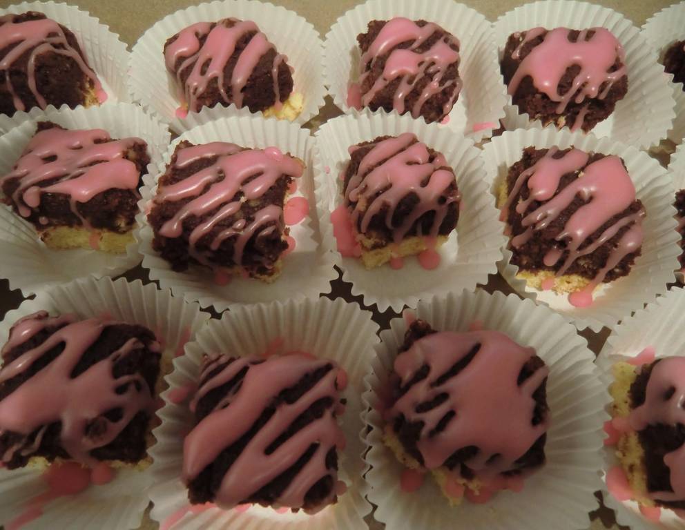 - Den Schokoladenteig auf dem hellen Boden gleichmäßig verteilen und in ca. 2x2 cm große Würfel schneiden.