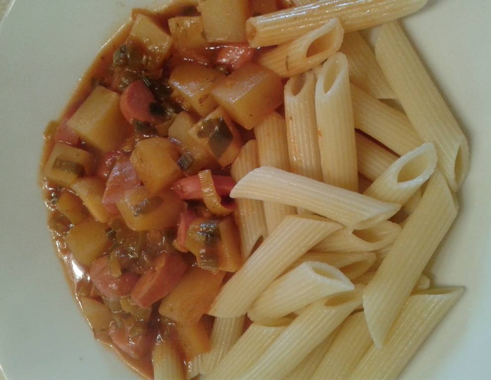 Zum Kartoffelgulasch mit Lauch und Frankfurter passen Nudeln oder Semmeln. Eventuell noch einen Löffel Sauerrahm oder eine klein geschnittene Essiggurke am Schluss unterrühren.